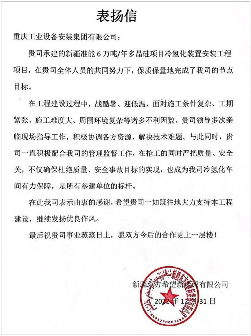 2022年12月31日,由四分公司承建的准能6万吨/年多晶硅项目的冷氢化生产线成功投产试车,标志着公司实施部分全面竣工。