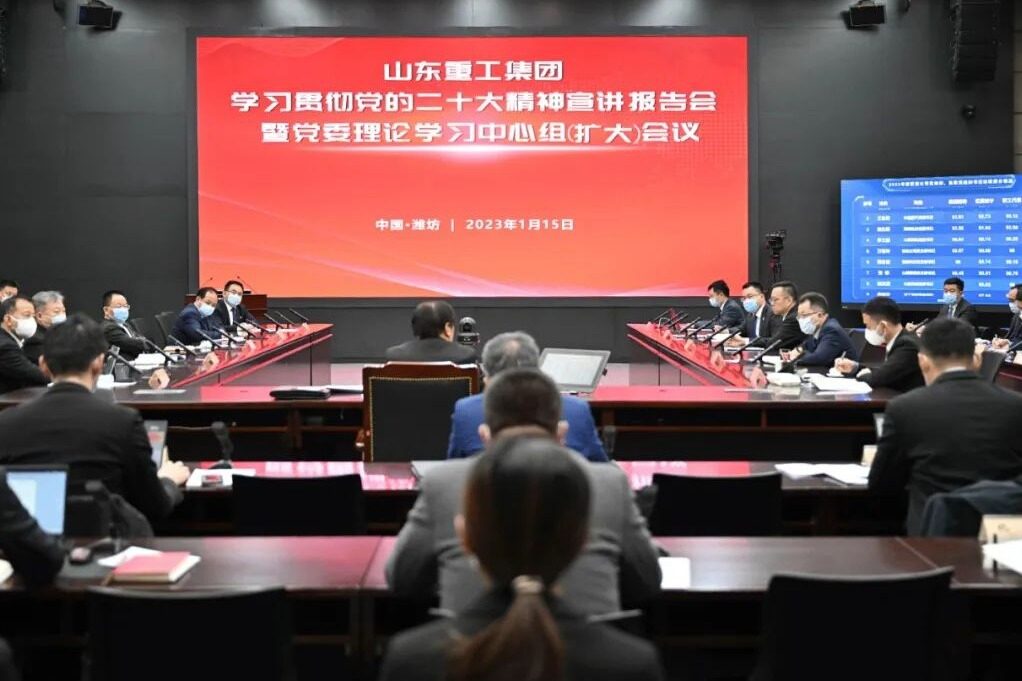 2023年1月15日下午2:00,山东重工集团召开学习贯彻党的二十大精神宣讲报告会暨党委理论学习中心组扩大会议。