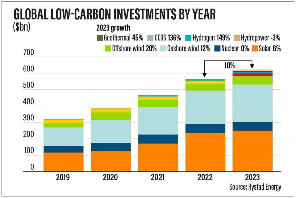 总部位于挪威的Rystad Energy表示,随着对风能项目的投资步伐加快,全球低碳项目的支出将在2023年增加10%,即增加约600亿美元。