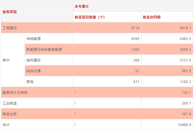 工程建设新签合同额人民币9910.1亿元,同比增长23.7%。其中传统能源新签合同额人民币2492.5亿元,同比增长23.9%;新能源及综合智慧能源新签合同额人民币3550.1亿元,同比增长83.9%;城市建设新签合同额人民币2121.6亿元,同比增长23.1%;其他新签合同额人民币1182.3亿元,同比增长26.9%。