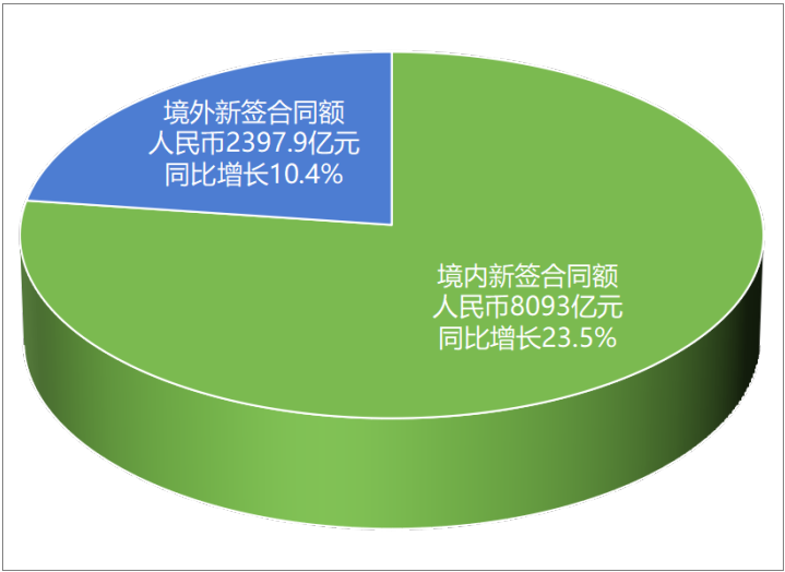 境内新签合同额人民币8093亿元,同比增长23.5。境外新签合同额人民币2397.9亿元,同比增长10.4%。