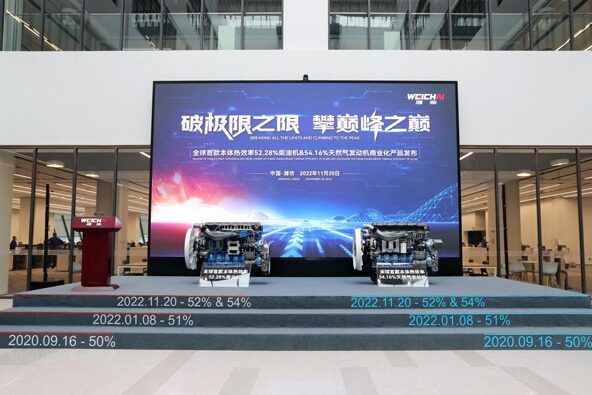成功发布本体热效率突破50.23%柴油发动机后,潍柴在科技“无人区”中锐意前行,分别于2022年1月发布本体热效率51.09%柴油机、2022年11月发布全球首款本体热效率52.28%商业化柴油机,以及本体热效率54.16%商业化天然气发动机。在领先技术的科技成果的强烈宣示下,我国内燃机研发迈入国际先进水平。