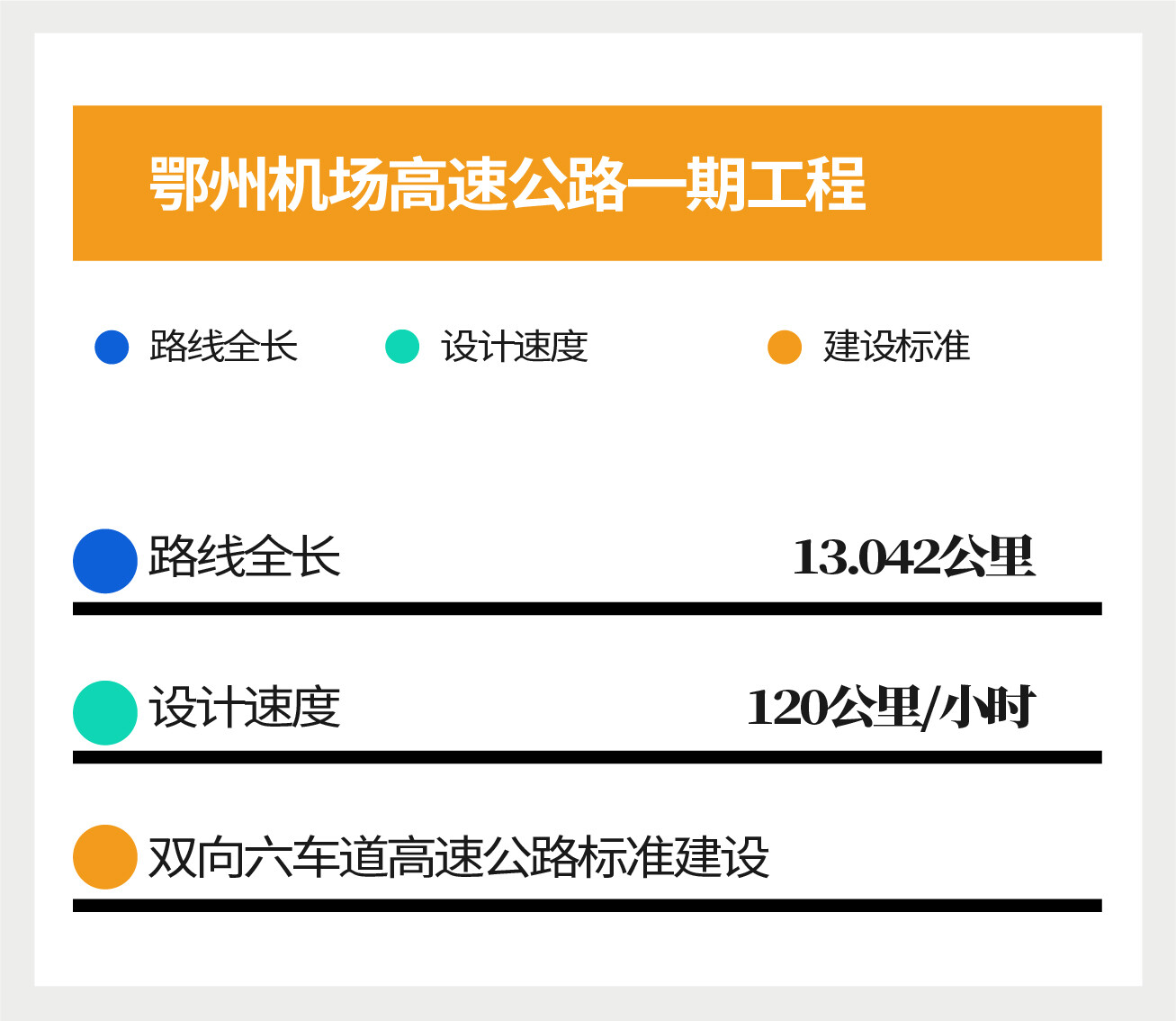 鄂州机场高速公路一期工程起点接花湖机场南接口,终点上跨武黄高速,采用每小时120公里的双向六车道高速公路标准建设。路线全长13.042公里,是湖北省首条智慧高速公路。