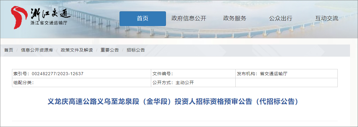 近日,浙江省交通运输厅发布了义龙庆高速公路义乌至龙泉段(金华段)投资人招标资格预审公告,金华市公路与运输管理中心为本项目招标人,项目估算总投资约372.2亿元,建安费约215.1亿元。