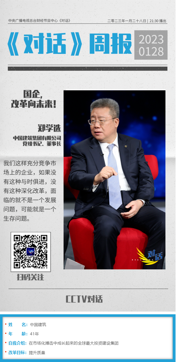 2023年1月28日晚21:30,中央广播电视总台财经频道《对话》栏目《国企,改革向未来!》对话三位央企主要负责人——中国建筑集团有限公司党组书记、董事长郑学选,中国海洋石油集团有限公司党组书记、董事长汪东进,中国化学工程集团有限公司党委书记、董事长戴和根;对话大考的两位组织者、见证者——国务院国有资产监督管理委员会秘书长彭华岗,中国社会科学院经济研究所所长、国有经济研究智库主任黄群慧,回顾国企改革三年行动的目标、历程、成就,感知国有企业发生的崭新变化,展望新一轮国企改革的使命任务。