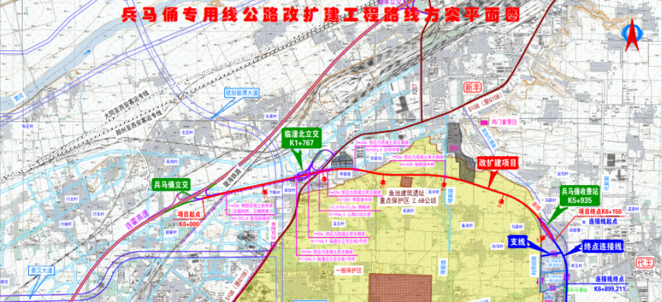 The starting point of the reconstruction and expansion project of the Terracotta Warriors and Horses Special Line is located at the Interchange of Terracotta Warriors and Horses of Lianhuo Expressway, and the end is located at Hujiazhai Village, Daiwang Street. The total length of the route is 6.15 kilometers. The main line of the project adopts the technical standard of two-way four-lane expressway, with a design speed of 100 km/h, a roadbed width of 26 meters, and a construction period of 2 years.