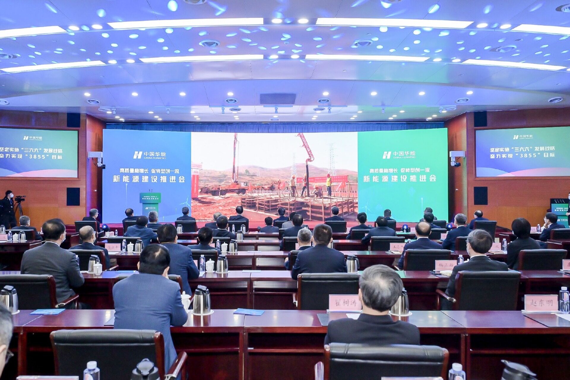 中国华能集团公司党组书记、董事长温枢刚出席会议并宣布首批新能源项目开工,总经理、党组副书记邓建玲讲话。国家能源局相关同志应邀出席,集团公司领导王森、樊启祥、王益华、王文宗、王利民、李向良、张涛等出席会议。