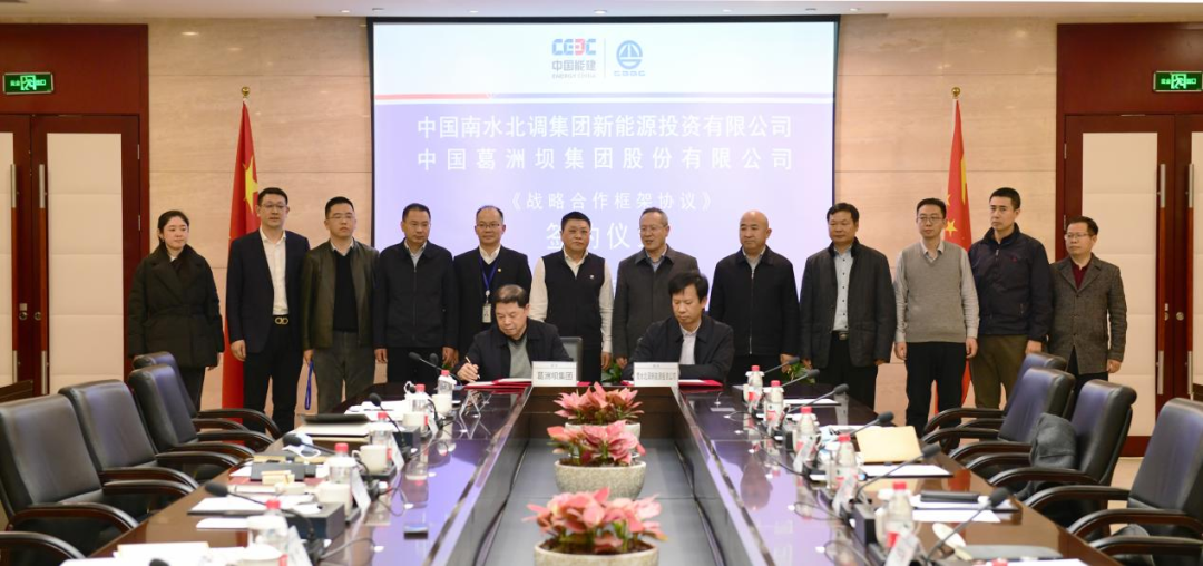 2023年2月6日,中国能建葛洲坝集团与中国南水北调集团新能源投资有限公司签订战略合作框架协议,双方将在新能源开发建设、科技创新发展、人才技术交流等方面开展战略合作。中国能建葛洲坝集团党委书记、董事长宋领,中国南水北调集团新能源投资有限公司党委书记、董事长侯社中见证签约。