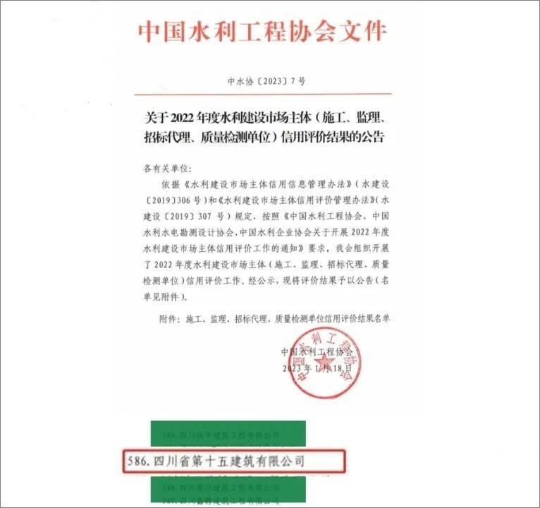 1月18日,四川十五建正式通过中国水利工程协会组织的2022年全国水利建设市场主体信用评价,取得AA级全国水利建设市场主体信用,这是四川十五建首次取得水利建设市场主体信用。(转载请注明见道网www.seetao.com)见道网工程栏目编辑/赵娥