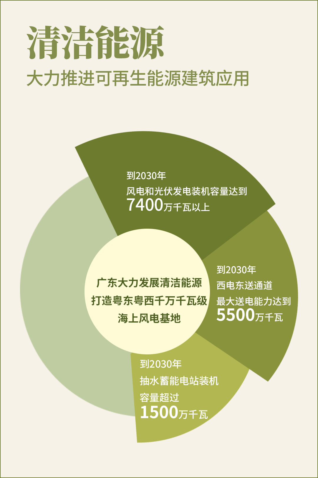 落实完成国家下达的可再生能源电力消纳责任权重。规模化开发海上风电,打造粤东粤西两个千万千瓦级海上风电基地,适度开发风能资源较为丰富地区的陆上风电。积极发展分布式光伏发电,因地制宜建设集中式光伏电站示范项目。因地制宜发展生物质能,统筹规划垃圾焚烧发电、农林生物质发电、生物天然气项目开发。到2030年,风电和光伏发电装机容量达到7400万千瓦以上。