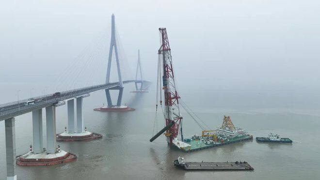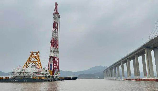 2023年2月8日,象山港大桥附近海域烟雾迷蒙,“水欣麒”1号打桩船在多艘护航船的配合下发出隆隆声,一根长57米、重约145吨的钢护筒被缓缓打入海底。市域铁路象山线开启海上作业新局面——象山港大桥南侧主桥动工。