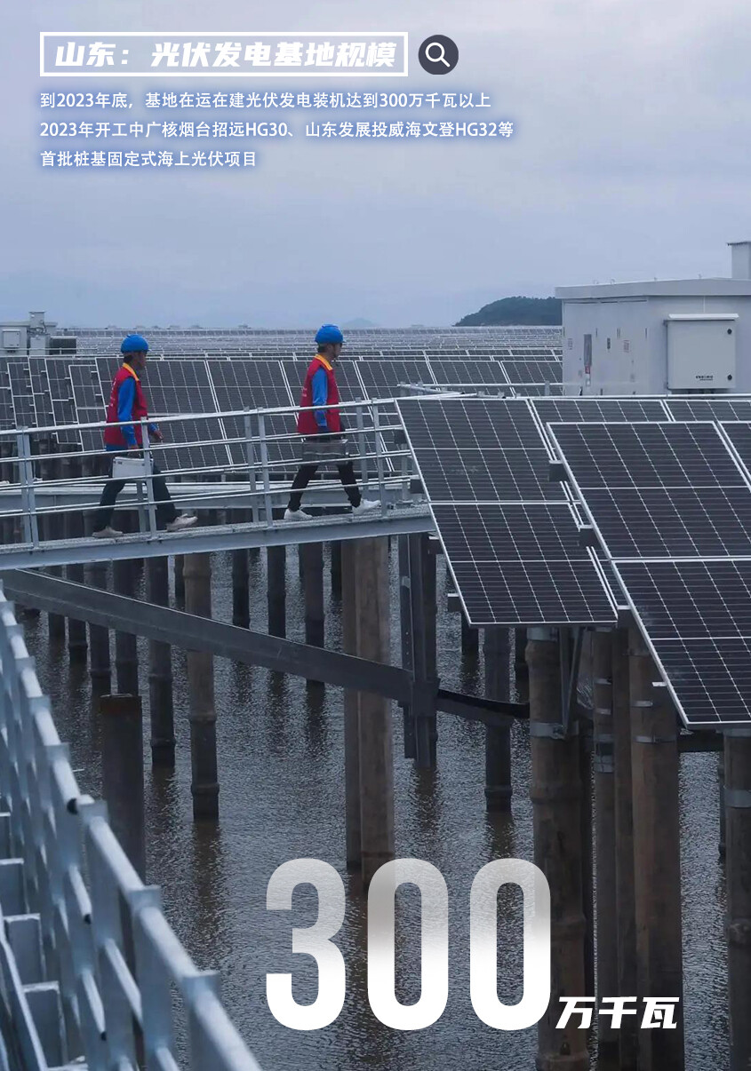 探索海上光伏基地开发。推进海上光伏基础性、前瞻性关键技术创新,在全国率先探索海上光伏规模化开发,开工中广核烟台招远HG30、山东发展投威海文登HG32等首批桩基固定式项目,规模150万千瓦。深入推进国电投半岛南3号等漂浮式项目研究论证,创建海上光伏实证基地。积极探索“海上光伏+”综合利用,推动海上光伏、海上风电、海洋牧场等融合发展。