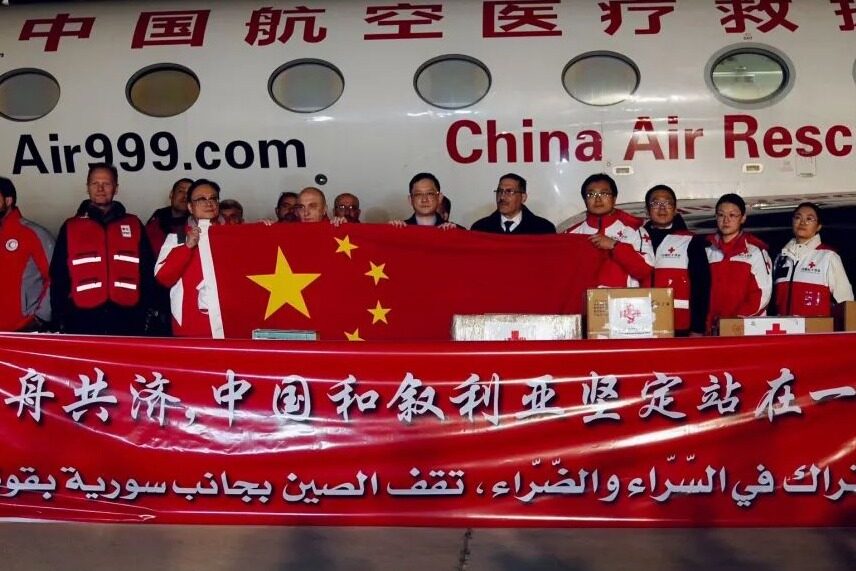في 9 فبراير 2023 ، وصلت إلى دمشق الدفعة الأولى من الإمدادات الطبية بمساعدة جمعية الصليب الأحمر الصينية. وتوجه السفير الصيني في سوريا شي هونغوي ، ومعتز نائب وزير الإدارة المحلية والبيئة في سوريا ، وخالد رئيس جمعية الهلال الأحمر السوري إلى المطار لاستقبالهم.