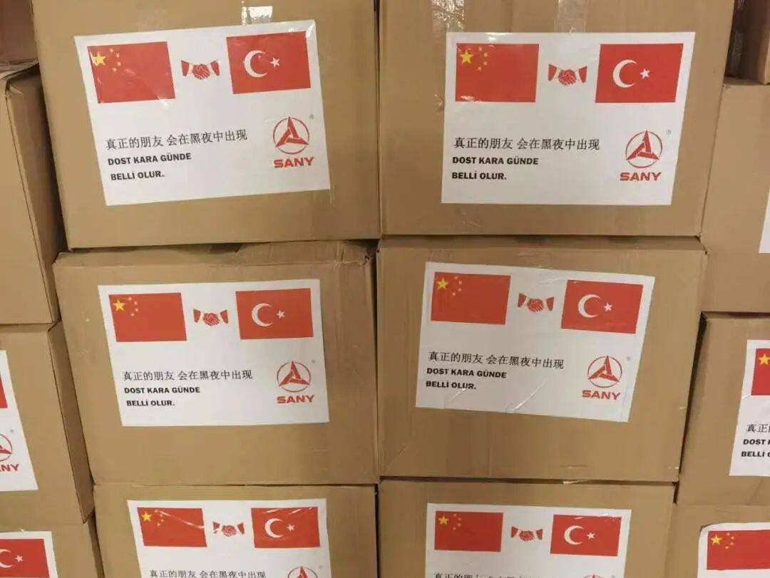 在三一捐赠给当地的物资包装箱上,印有一句土耳其谚语:“Dost kara günde belli olur真正的朋友会在黑夜中出现”。作为一家国际化的中国企业,三一集团万里驰援只为生命至上,于患难处伸援手、现真情,携手共筑人类命运共同体!(转载请注明见道网www.seetao.com)见道网工程栏目编辑/赵娥
