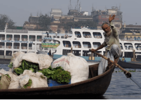 在帕德玛河上摆渡运菜的孟加拉国船夫