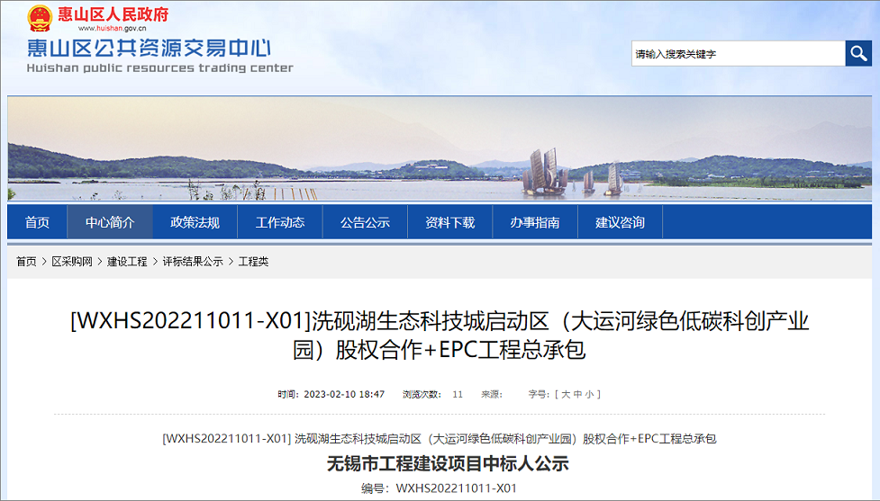 Recently, the winning bid for the Grand Canal Green and Low-Carbon Science and Innovation Industrial Park project in the start-up area of Xiyan Lake Ecological Science and Technology City in Wuxi, Jiangsu Province has been released. The consortium composed of China Energy Construction and Gezhouba Group won the bid, with an estimated contract price of 13.3 billion yuan.