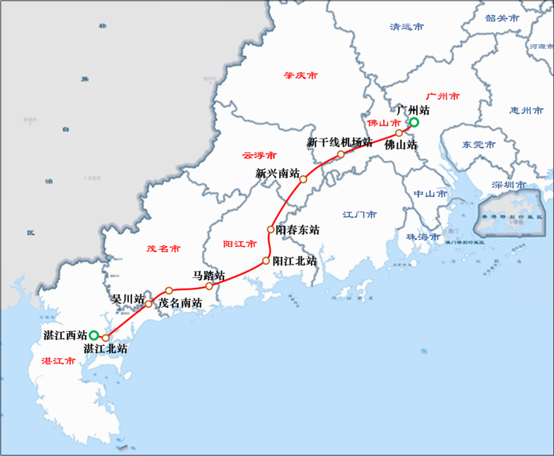 Guangzhou-Zhanjiang High-speed Railway is located in Guangdong Province. The line starts from the Guangzhou hub station, passes through Guangzhou, Foshan, Zhaoqing, Yunfu, Yangjiang, Maoming, Zhanjiang and other cities along the way, and ends at the planned Zhanjiang North Station. The total length of the line is about 401 km, and the design speed is 350 km/h.