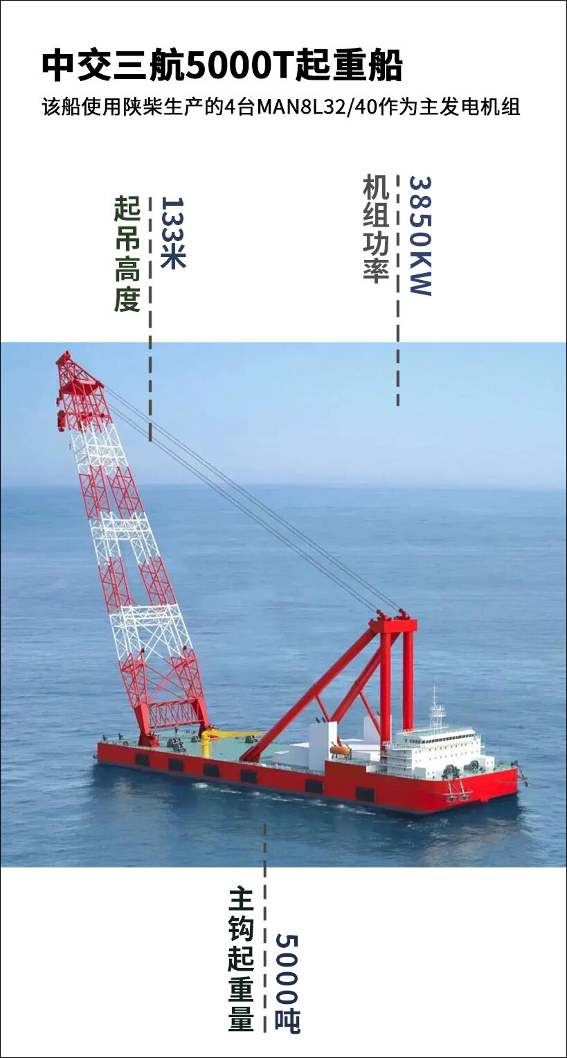 该船主要用于海上风电桩基础施工、升压站及大型海上结构安装及其海事工程,主钩起重量5000吨,起吊高度甲板上可达133米,具备动力定位和锚泊定位能力。使用陕柴生产的4台MAN8L32/40作为主发电机组,机组功率3850KW,能为该船提供充足可靠的动力保障。
