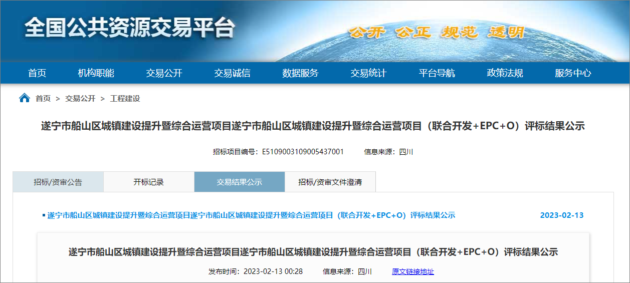 On February 13, 2023, the Sichuan Provincial Public Resources Trading Center announced the winning bid for the urban construction improvement and comprehensive operation project in Chuanshan District, Suining City. A consortium consisting of Survey and Design Institute Co., Ltd., Sichuan Industrial Equipment Installation Group Co., Ltd., and China Huaxi Enterprise Co., Ltd. won the bid for this project.