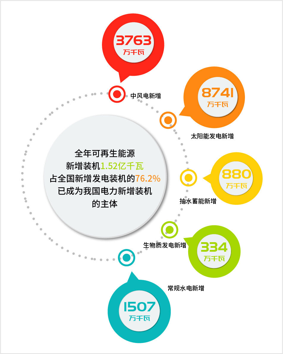 2022年中国风电、光伏发电新增装机突破1.2亿千瓦,创历史新高,带动可再生能源装机突破12亿千瓦。2022年,全国风电、光伏发电新增装机突破1.2亿千瓦,达到1.25亿千瓦,连续三年突破1亿千瓦,再创历史新高。全年可再生能源新增装机1.52亿千瓦,占全国新增发电装机的76.2%,已成为我国电力新增装机的主体。其中风电新增3763万千瓦、太阳能发电新增8741万千瓦、生物质发电新增334万千瓦、常规水电新增1507万千瓦、抽水蓄能新增880万千瓦。截至2022年底,可再生能源装机突破12亿千瓦,达到12.13亿千瓦,占全国发电总装机的47.3%,较2021年提高2.5个百分点。其中,风电3.65亿千瓦、太阳能发电3.93亿千瓦、生物质发电0.41亿千瓦、常规水电3.68亿千瓦、抽水蓄能0.45亿千瓦。(转载请注明见道网www.seetao.com)见道网战略栏目编辑/许生鹏