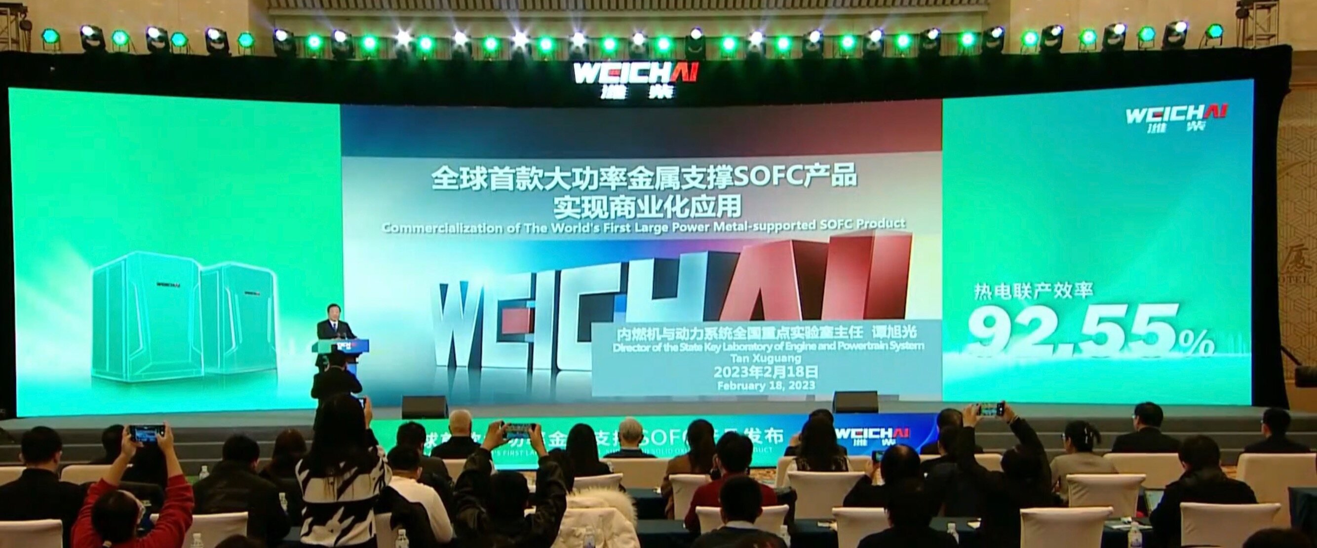 On the morning of February 18, 2023, Weichai released the world's first high-power metal-supported solid oxide fuel cell SOFC commercial product. Ling Wen, Academician of Chinese Academy of Engineering and president of Shandong Association for Science and Technology; Su Wanhua, academician of Chinese Academy of Engineering and Professor of Tianjin University; Liu Weimin, academician of Chinese Academy of Sciences and researcher of Lanzhou Institute of Chemical Physics of Chinese Academy of Sciences; Shu Gequn, Secretary of Party Committee and Professor of University of Science and Technology of China attended the new product launch event. Tan Xuguang, Director of the National Key Laboratory of Internal Combustion Engine and Power System, introduced the technology and application of Weichai SOFC products in detail.