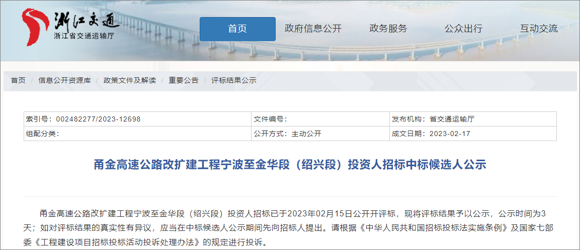 On February 17, 2023, the Zhejiang Provincial Public Resources Transaction Supervision Network released the public announcement of the candidates for the bidding of the Ningbo-Jinhua section of the Shaoxing section of the Ningbo-Jinhua Expressway Reconstruction and Expansion Project. The cost is 7.711 billion yuan, and the local leading enterprise won the bid.