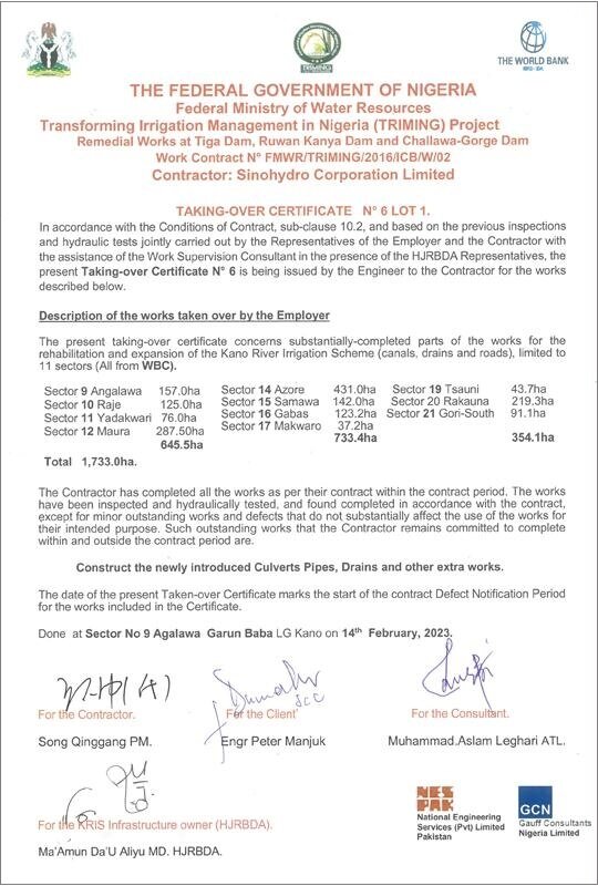 2023年2月14日,中国电建尼日利亚卡诺灌溉项目完成所有剩余地块的正式验收移交工作,取得完工证书并进入质保期,项目有关方代表出席现场移交仪式。