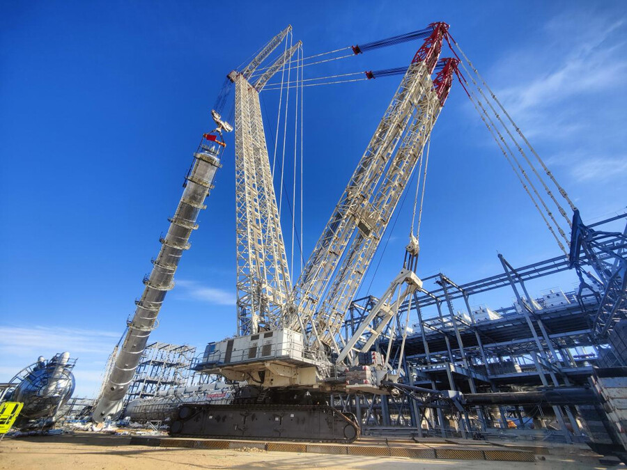 精馏3级塔是精馏装置的核心塔器之一,吊装重量800吨、直径6米、高度93.75米。本次吊装采用公司自有、全球首台可拆解为1600吨车型的3200吨级履带式起重机作为主吊机,600吨履带式起重机溜尾递送。