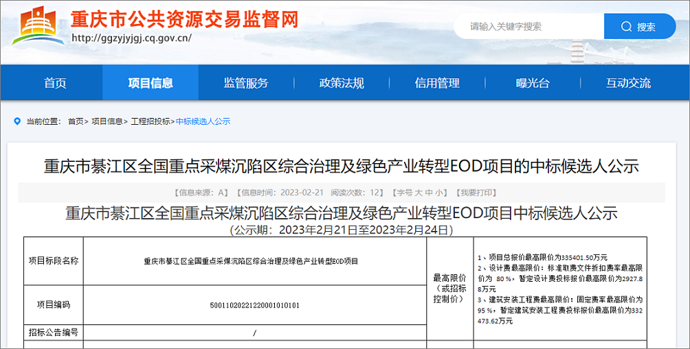 2023年2月21日,重庆市公共资源交易网发布重庆市綦江区全国重点采煤沉陷区综合治理及绿色产业转型EOD项目中标候选人公示,第一中标候选人为中国建筑第八工程局有限公司牵头,与中建八局西南建设工程有限公司、中建八局两江建设有限公司组成的联合体,投标报价33.5亿元。