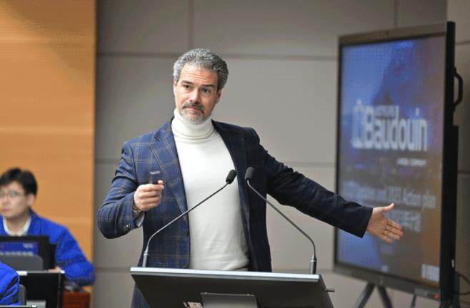 法国博杜安管理团队法布里奇奥·莫兹、格拉齐亚诺·卡尔佐拉里、马赫迪·克比利分别作工作汇报。(转载请注明见道网www.seetao.com)见道网工程栏目编辑/邢文涛