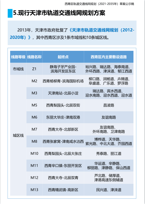 城区线包括M2、M3、M5、M6、M7、M8、M10、M11、M12、M13、M14、M15主要承担西青区与津城核心区之间、以及西青区内部功能组团之间的大规模通勤、生活等出行联系形成网络化服务。(转载请注明见道网www.seetao.com)见道网战略栏目编辑/许生鹏