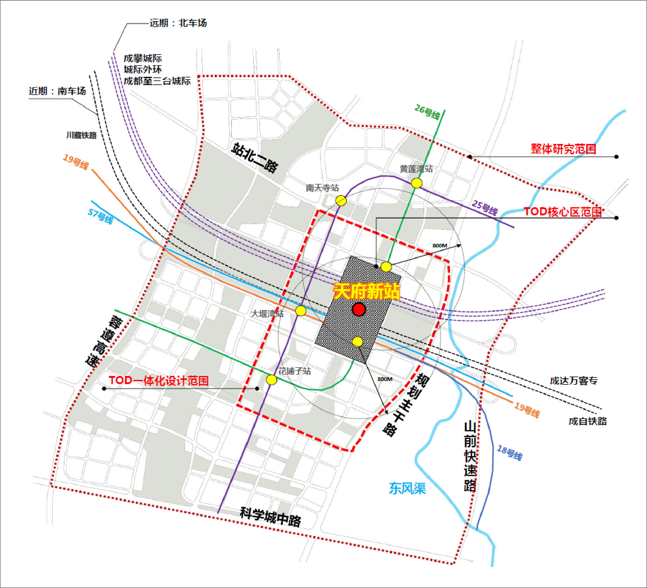 Sichuan Tianfu Station, as an important part of the "four main and three auxiliary" passenger transport hub system of Chengdu Railway Hub, is one of the important inter-city hub nodes in the Chengdu-Chongqing Economic Circle. It undertakes the Chengdu-Zigong Railway, Chengdu-Dawan-Wan Railway and Sichuan-Tibet Railway in the near term (south field), and the Chengdu-Panzhou Inter-city Railway, the outer ring of Chengdu, and the Chengdu-Santai Inter-city Railway in the long term (north field).
