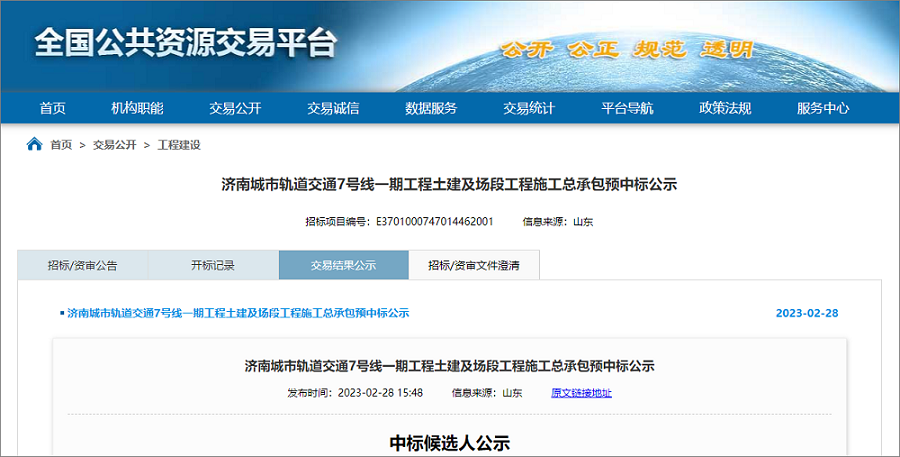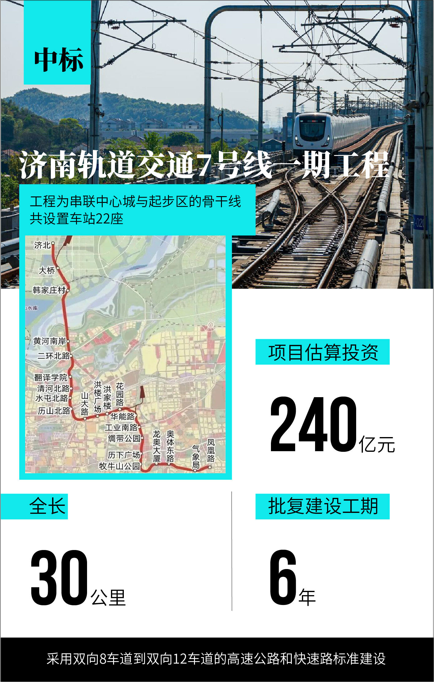 2023年2月28日,全国公共资源交易平台发布济南城市轨道交通7号线一期工程土建及场段工程施工总承包预中标公示,该项目由中国建筑第八工程局牵头的联合体中标,投标总报价124.2亿元。