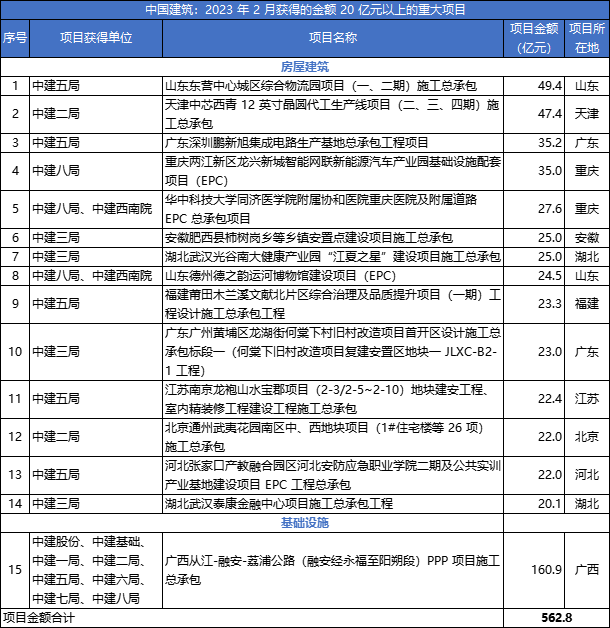 近日,中国建筑股份有限公司发布重大项目公告,公司于近期新签了15项单笔金额在20亿元以上的重大项目合同,累计项目合同额约562.8亿元。具体的项目清单如下: