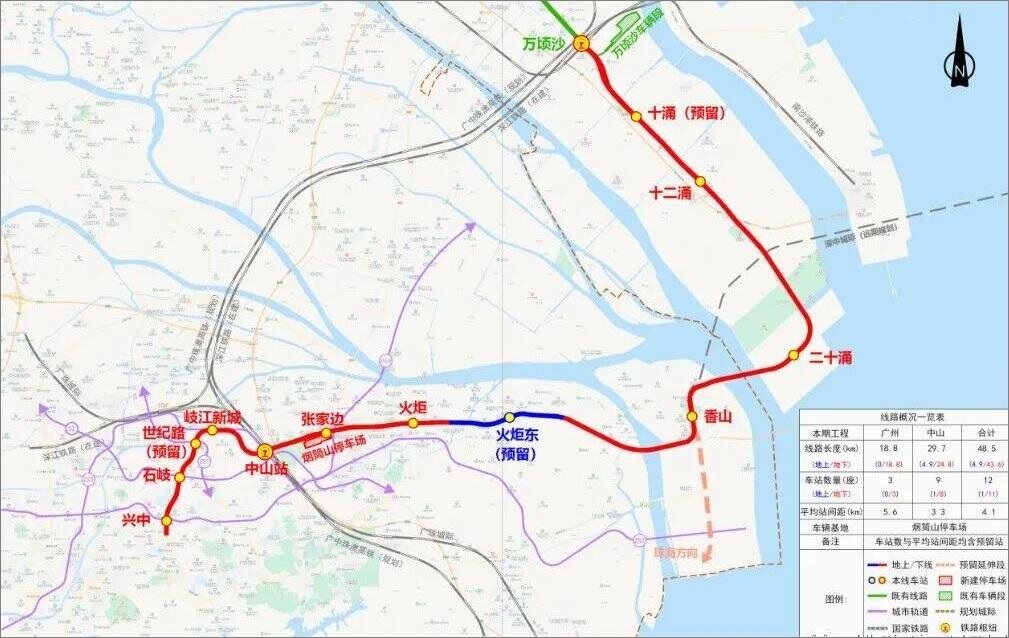 The line starts from Wanqingsha Station, Nansha District, Guangzhou City, and ends at Xingzhong Station, Zhongshan City. The new line is 47.6 kilometers long, including 19.1 kilometers in Guangzhou and 28.5 kilometers in Zhongshan. The line is reserved for extending from Xiangshan Station to Zhuhai, and the reserved project from Xiangshan Station to Zhuhai will be implemented simultaneously.