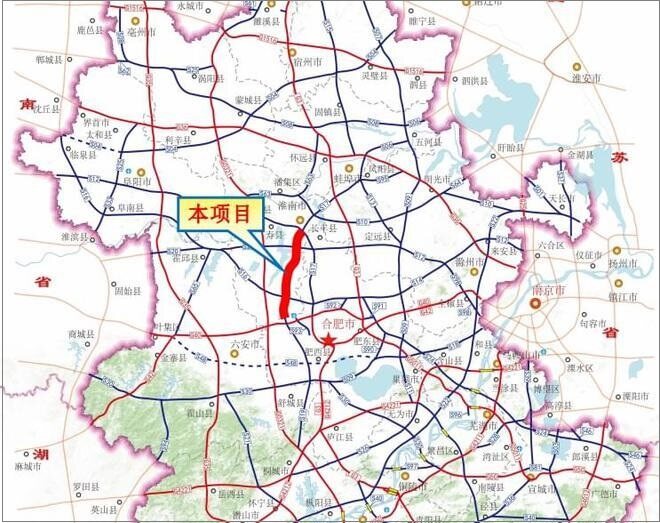 The Huainan section of Huainan-Tongcheng Expressway has a total length of about 56.438 kilometers. There are 2 super-large bridges, 21 large bridges, and 19 small and medium bridges along the whole line; 7 cross-bridges on branch lines; 7 interchanges including Cao'an, Shiyuan, Dashun, Xiaodian, Lishan, Liugang, and Liugangxi For the overpass, 5 ramp toll stations, 2 service areas, 1 maintenance work area, 1 traffic police barracks, 1 traffic law enforcement station and other necessary traffic engineering and facilities along the line will be constructed simultaneously.