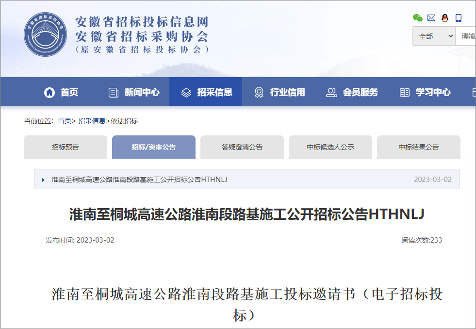 On March 2, 2023, the Anhui Bidding and Purchasing Association released the public bidding announcement for the subgrade construction of the Huainan section of the Huainan-Tongcheng Expressway. billion.