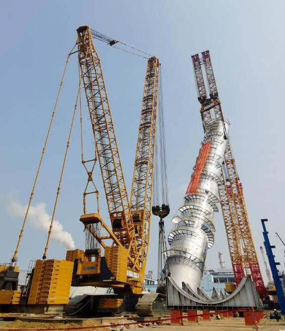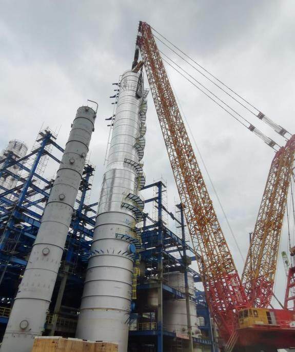 2023年3月3日,陕西化建吊运公司采用4000吨履带式起重机在海南逸盛石化项目完成CTA1装置第二台高压精馏塔吊装。