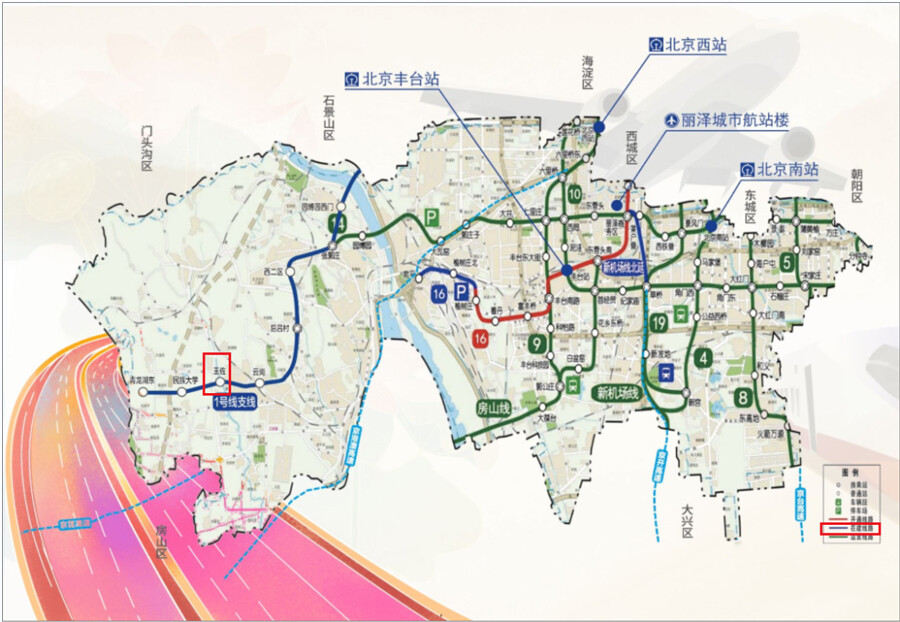 Among them, the branch line project of Line 1 is located in Fengtai District and Shijingshan District, from Qinglong Lake East Station in the west to Bajiao Amusement Park Station of Line 1 in the east, with a total length of 19.9 kilometers, 9 stations and a new parking lot.