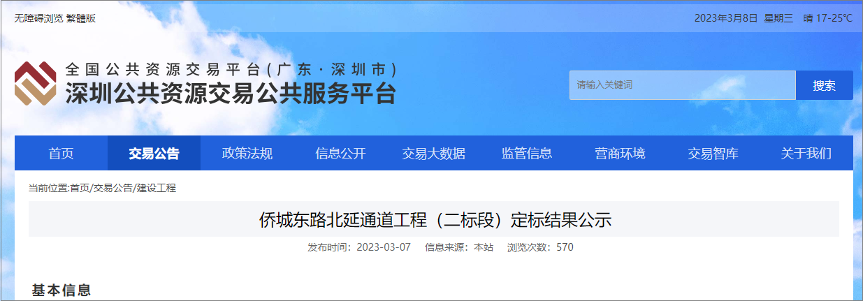 2023年3月7日,广东省公共资源交易平台发布了深圳侨城东路北延通道工程定标结果公示,本次中标的项目分别为二标段,三标段,中标总金额约121亿元。
