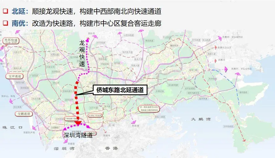 侨城东路北延通道工程北起福龙路,南至滨海大道,全长约15.7km,采用城市快速路标准,双向六车道。