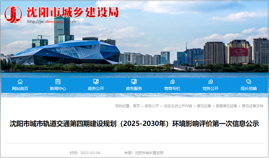 On March 6, 2023, the Shenyang Urban and Rural Construction Bureau made the first information publicity on the environmental impact assessment of the fourth phase of Shenyang urban rail transit construction planning (2025-2030).