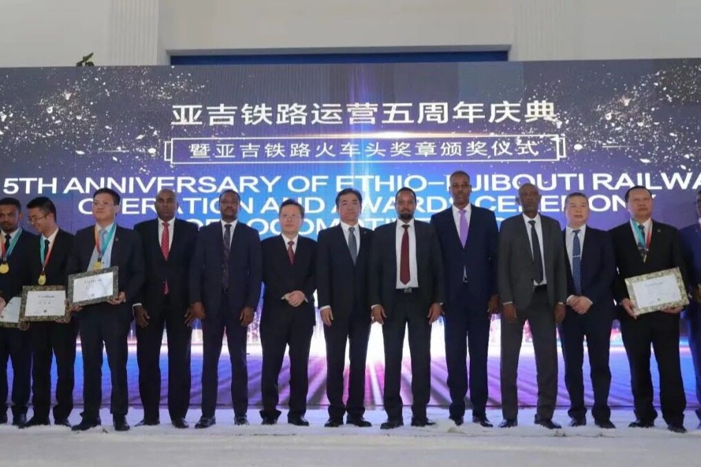 当地时间2023年3月8日,在埃塞俄比亚首都亚的斯亚贝巴的拉布车站隆重举行了亚吉铁路运营五周年庆典暨亚吉铁路火车头奖章颁奖仪式。中国驻埃塞俄比亚使馆大使赵志远、经济商务参赞杨依杭,埃塞俄比亚财政部长希德、交通部国务部长登格·博鲁,吉布提基础设施和设备部长哈桑·胡米德·易卜拉欣,埃塞-吉布提铁路公司总经理阿卜迪以及中铁二局埃塞分公司相关负责同志等参加活动,并为对亚吉铁路建设运营做出突出贡献的中国、埃塞、吉布提三国员工颁发了火车头奖章。