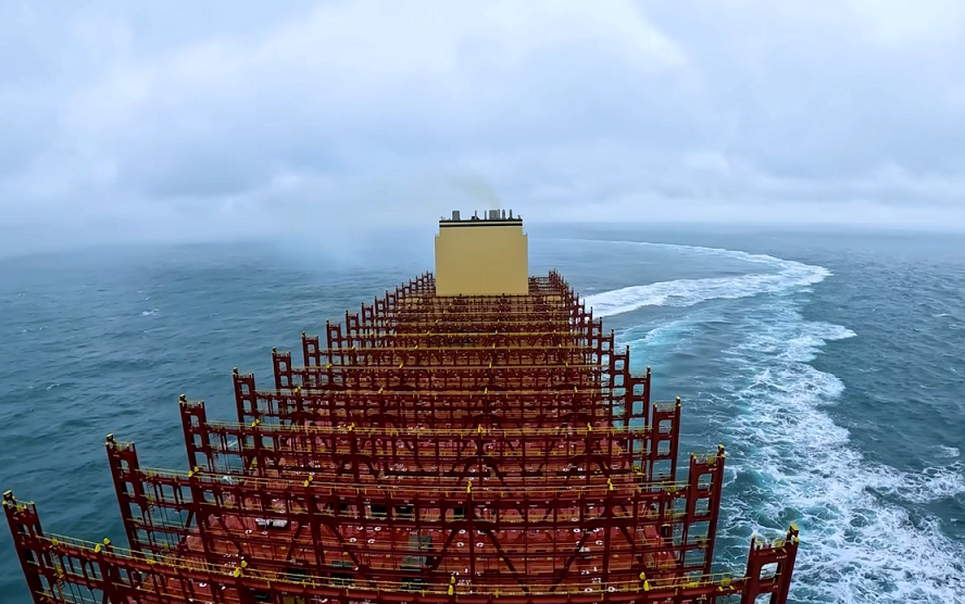 该船由沪东中华自主设计,拥有完全自主知识产权,入DNV船级社。该船总长399.99米,比目前世界最大航母还要长60多米;型宽61.5米,甲板面积近似于4个标准足球场;型深33.2米,最大堆箱层数可达25层,相当于22层楼的高度,可承载24万多吨货物,一次可装载24116只标准集装箱,是当之无愧的海上巨无霸和带货王。