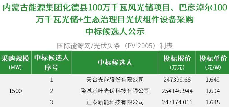 2023年3月12日,内蒙古能源集团化德县100万千瓦风光储项目、巴彦淖尔100万千瓦光储+生态治理目光伏组件设备采购中标候选人公示。天合光能股份有限公司、隆基乐叶光伏科技有限公司、正泰新能科技有限公司3家企业入围。