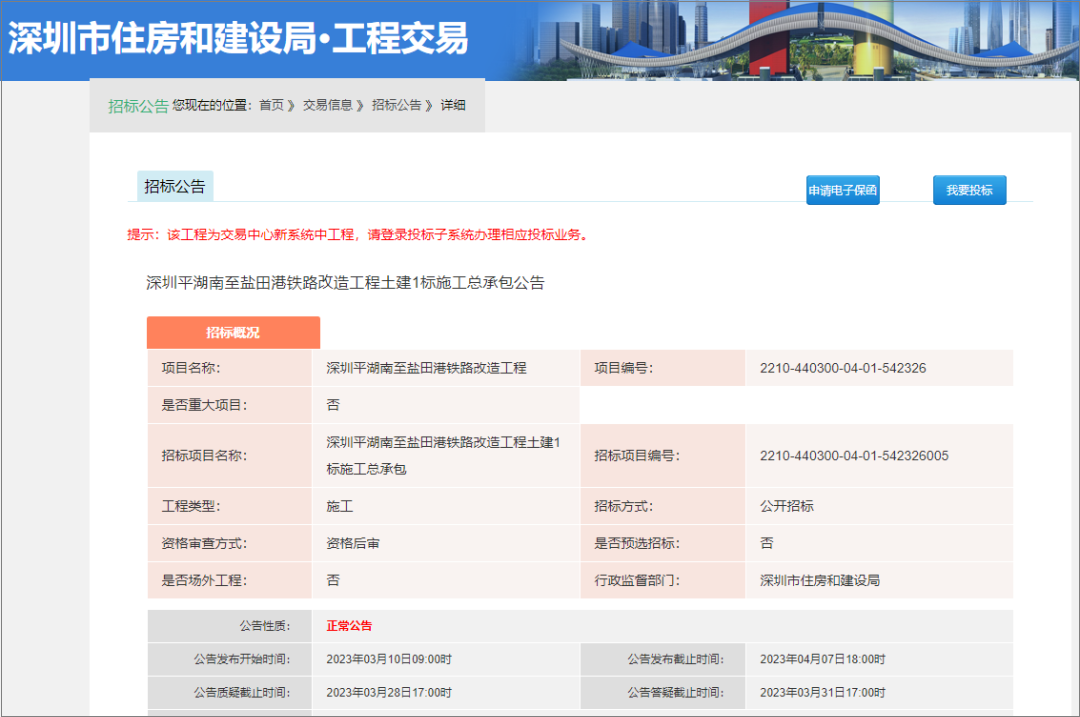 2023年3月10日,深圳平湖南至盐田港铁路改造工程土建1标~5标施工总承包招标公告发布。项目计划总投资75.33亿元,建设工期4年。