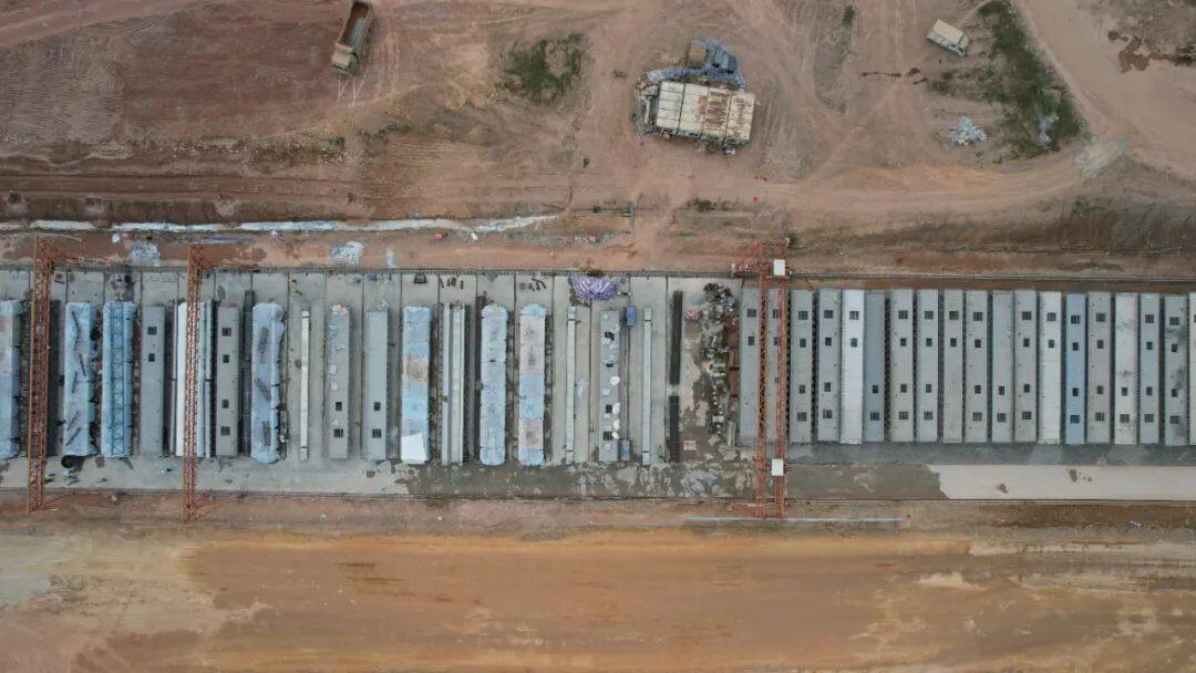 该项目土建2标阳江北互通附近的预制梁厂,现场同样施工忙碌,已经浇筑好的数十片预制箱梁整齐地摆放在工地上。