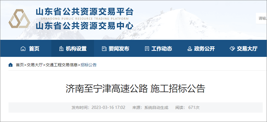 2023年3月16日,山东省公共资源交易平台发布济南至宁津高速公路施工招标公告,招标人山东高速建设管理集团有限公司,预计总投资约166.53亿元。