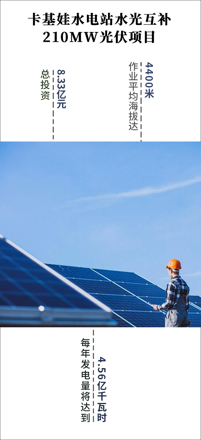 卡基娃水电站水光互补210MW光伏项目位于4150至4450米之间的高海拔地区,项目区域阳光资源充沛,光伏发电优势明显。据施工单位中建二局项目负责人介绍,该项目总投资8.33亿元,项目建成后每年发电量将达到4.56亿千瓦时,可节约标准煤11.42万吨,减少二氧化碳排放30余万吨,预计实现年均产值1.1亿元,每年增加地方财税1000余万元。