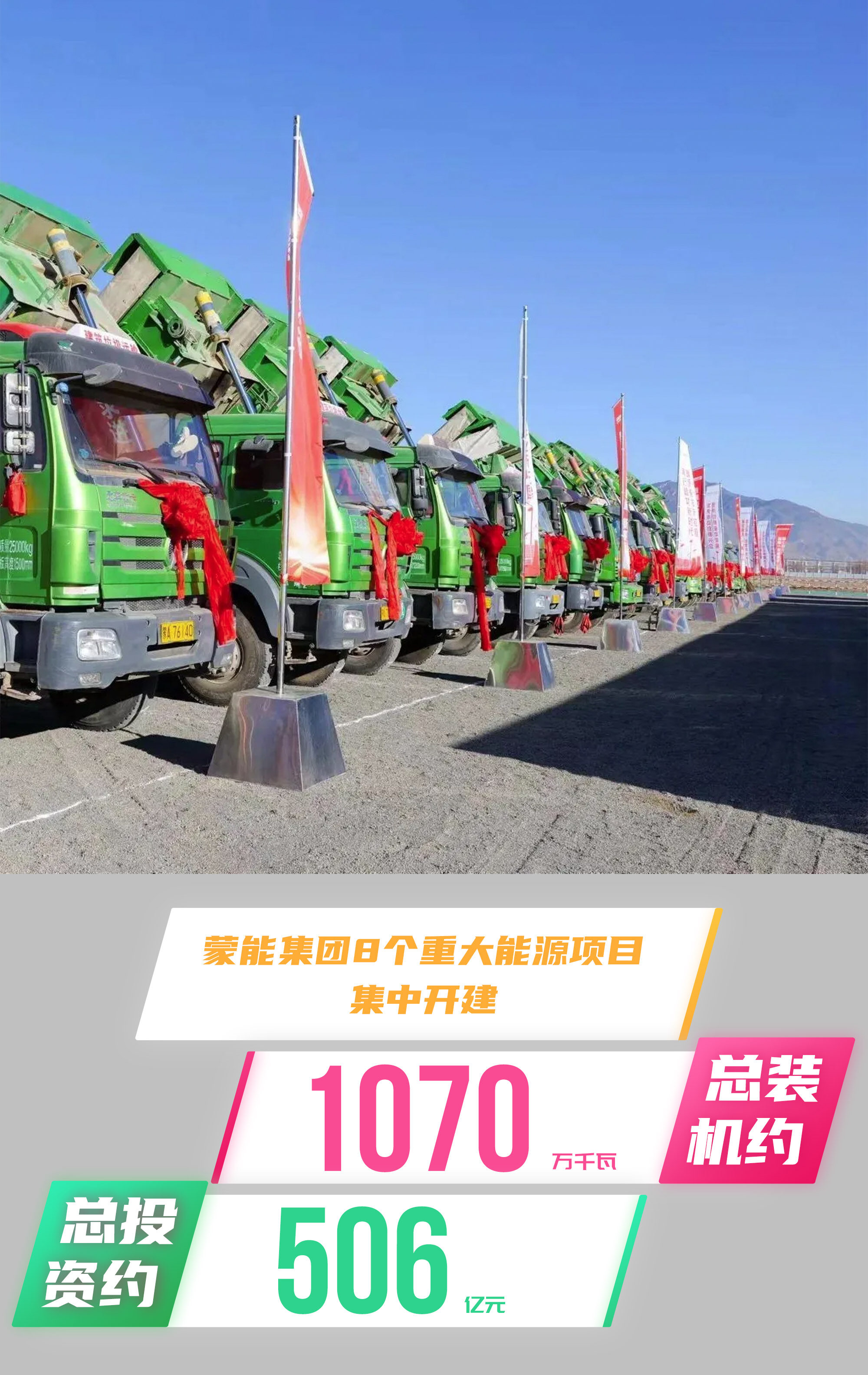 2023年3月18日,内蒙古能源集团有限公司举行重大能源项目集中开工仪式。据介绍,此次集中开工的8个项目,包括6个新能源项目和2个火电项目,总投资506亿元,总装机1070万千瓦,装机相当于再造一个蒙能集团,创造了自治区所属国有企业一次性开工规模最大、投资额度最多的历史记录。8个项目全部投产运营后,年发电量可达380亿千瓦时,减排二氧化碳1500多万吨,节约标煤540万吨。